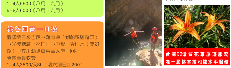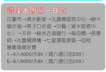 花蓮旅遊GO服務了數萬旅遊人次,兩三人也能成行,一天只要三千元!比租車還划算。快與我們聯絡:0933-992577